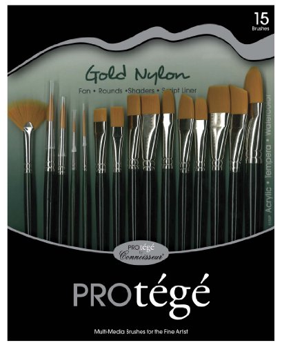 Protege by Connoisseur that are priced for the hobbyist, weekend painter or the budding fine artist. Protege line is manufactured to award the beginning painter with a set of tools that will perform as they should, at a price point that will encourage experimentation and open up the world of fine art. Short handle, gold nylon fifteen piece brush set contains wash brushes, shaders, flats, fans and rounds in generous sizes.