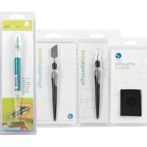 The Tool Package includes the following set of Silhouette Cameo Tools:The Silhouette Spatula - The perfect tool to lift delicate designs from the cutting mat without curling or tearing. The pointed tip makes it easy to slide under cut-out designs and work around the most intricate shapes.The Silhouette Hook - An essential tool for weeding vinyl and heat transfer cutouts. The Silhouette Scraper - Used to apply transfer paper to vinyl artwork, smooth adhesive to temporary tattoo paper, and scrape cutting mats clean.The Silhouette Pick-Me-Up Tool -Used for picking up and placing small objects lik